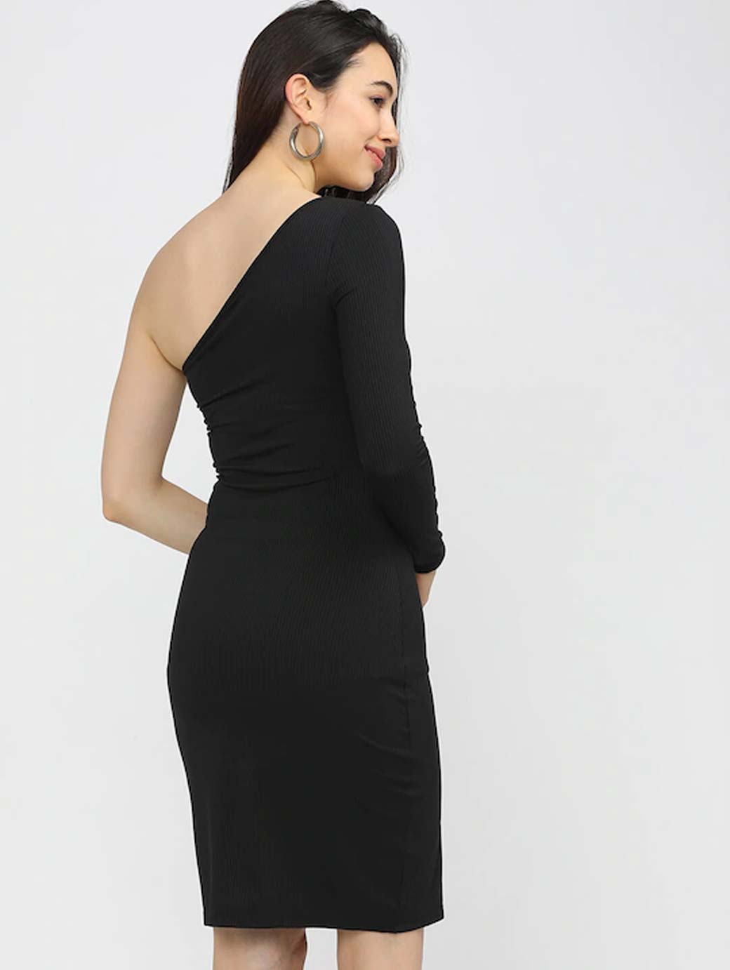 Black solid, bodycon dress One shoulder Long, regular sleeves, Above-knee length in straight hem Knitted fabric.