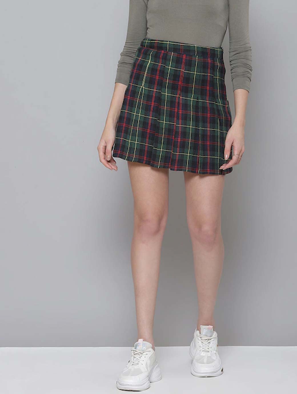 Green & Navy Blue Checked A-Line Pure Cotton Skirt