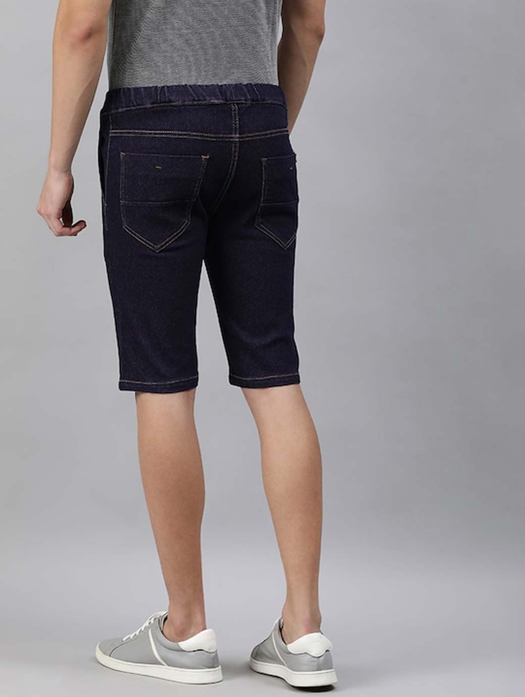 Blue washed mid-rise denim shorts, has 4 pockets, and drawstring closure