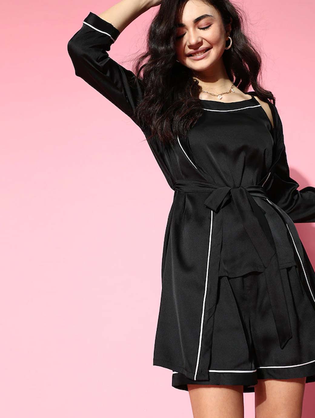 Add a subtle touch of elegance to your sleepwear collection with this graceful night suit. This night suit's lovely shoulder straps and three-quarter sleeves will keep you comfortable. Stylish black colour Classic solid pattern Shoulder straps Three-quarter sleeves Polyester, machine wash Trend Alert Silky and smooth, satin dates back to medieval China. With a lustrous surface on one side and a duller surface on the other, it is used in a variety of clothing styles to lend comfort and a rich look. The fall and flow of this fabric is its unique aspect. Convenient to wash and maintain, this fabric is a popular choice.