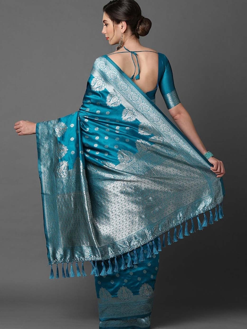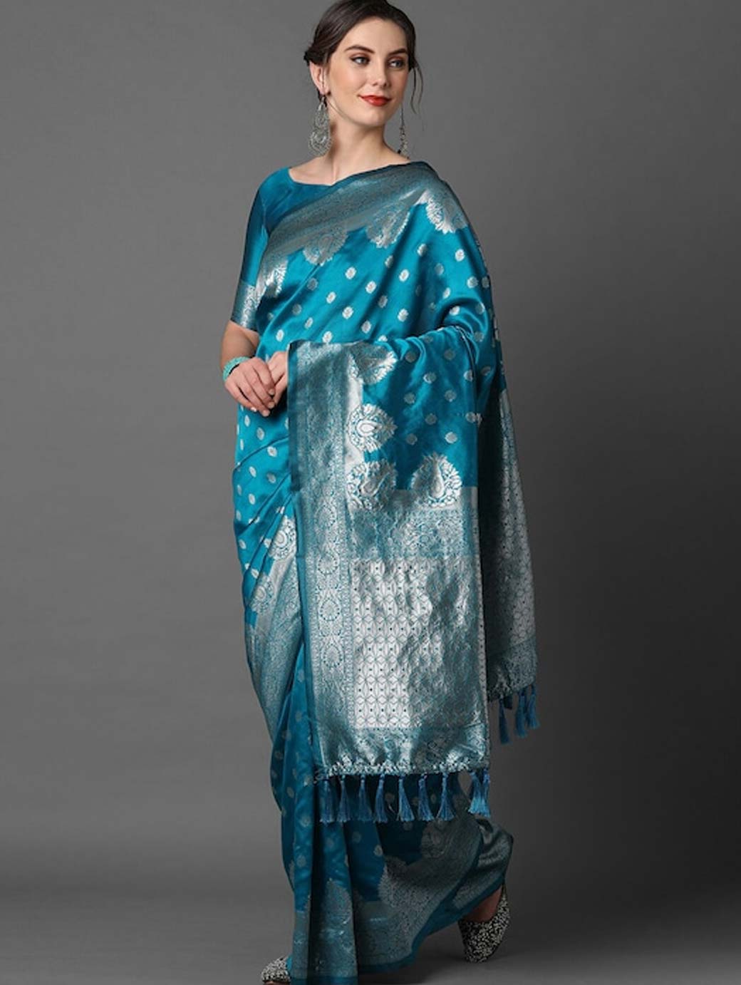 Blue & Silver-Coloured Ethnic Motifs Woven Design Silk Blend Banarasi Saree