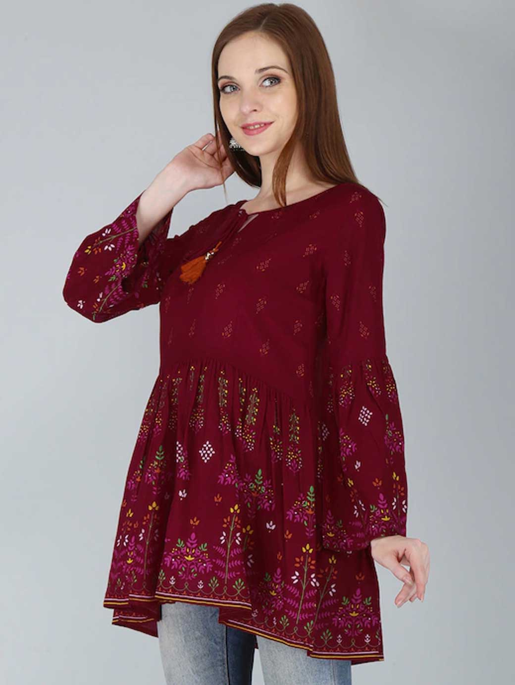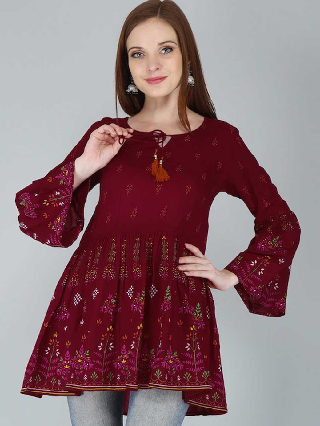 Red regular peplum top Floral print Round neck, three-quarter, bell sleeve sleeves Tie-ups detail Knitted cotton.