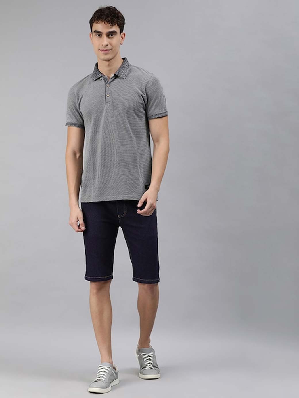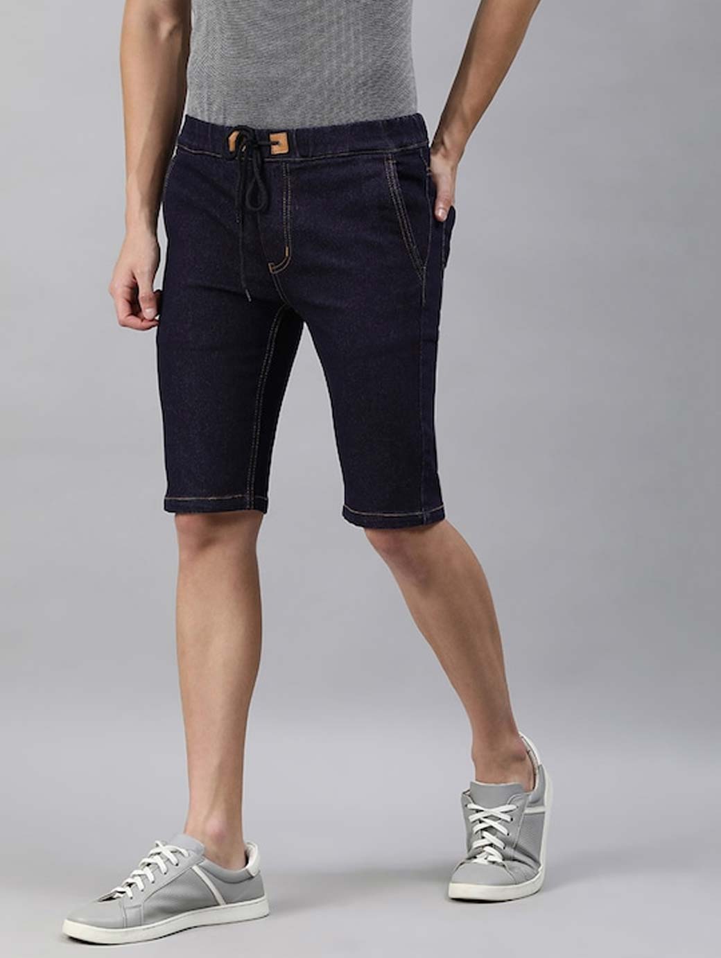 Blue washed mid-rise denim shorts, has 4 pockets, and drawstring closure