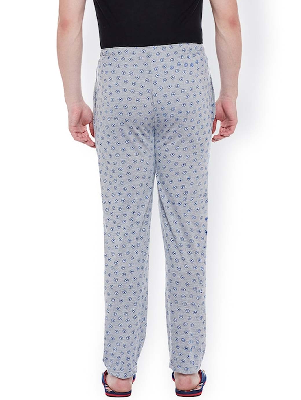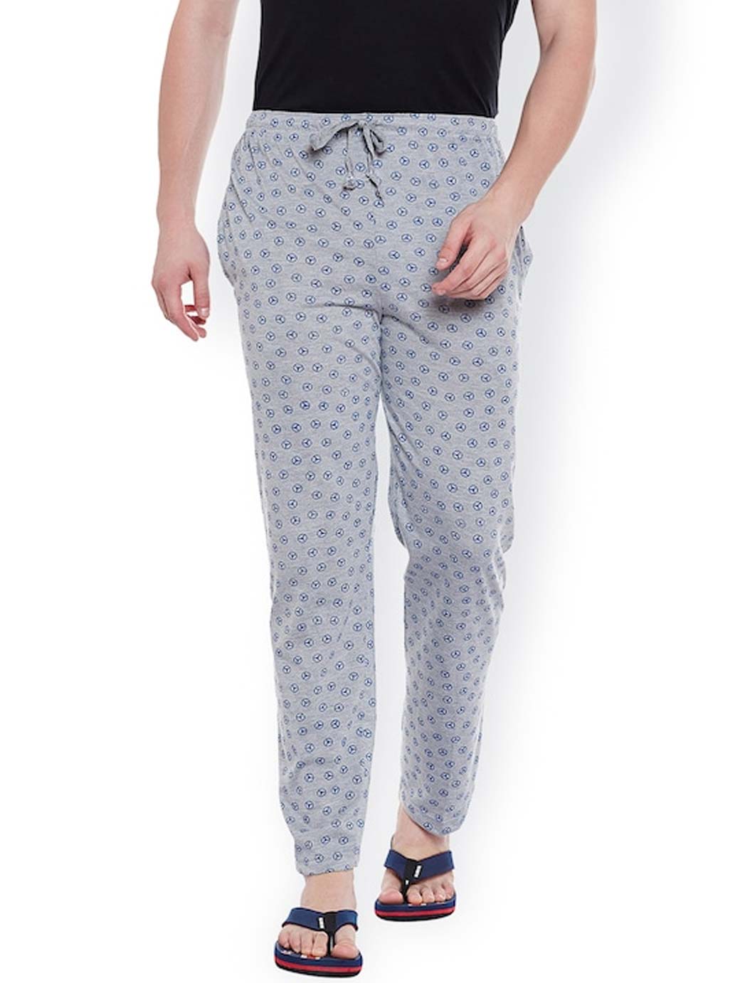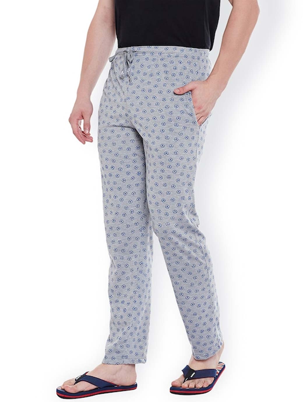 Grey melange printed lounge pants, has two pockets, an elasticated waistband with drawstring fastening