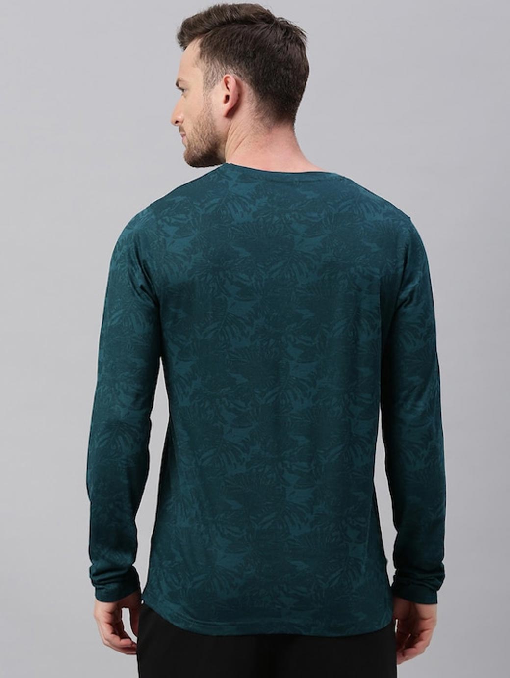 Teal green Tropical printed T-shirt, has a round neck, and long sleeves