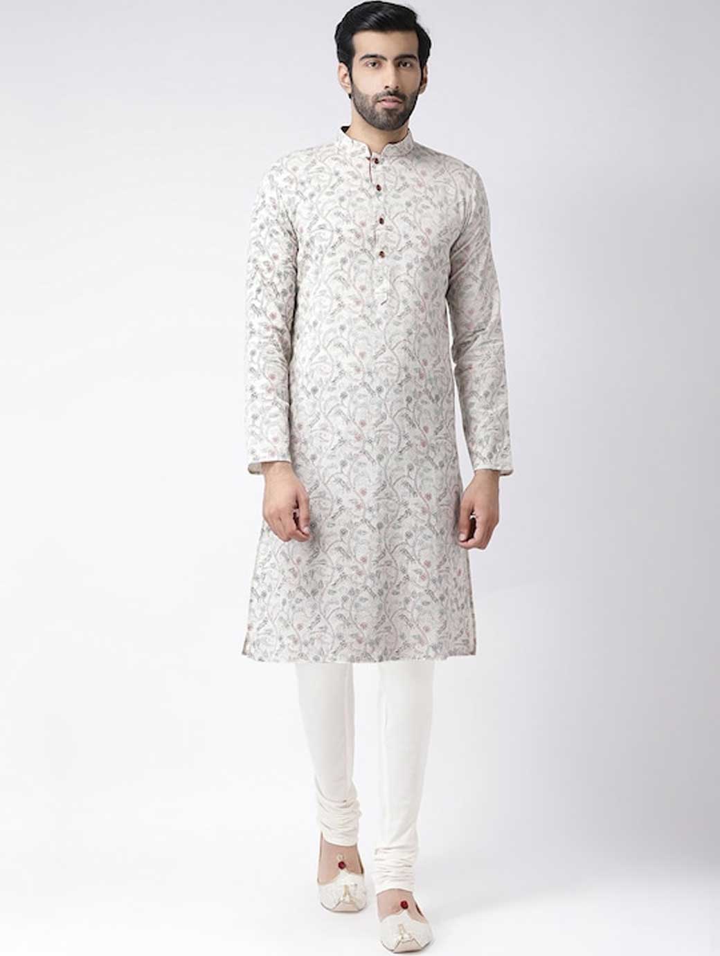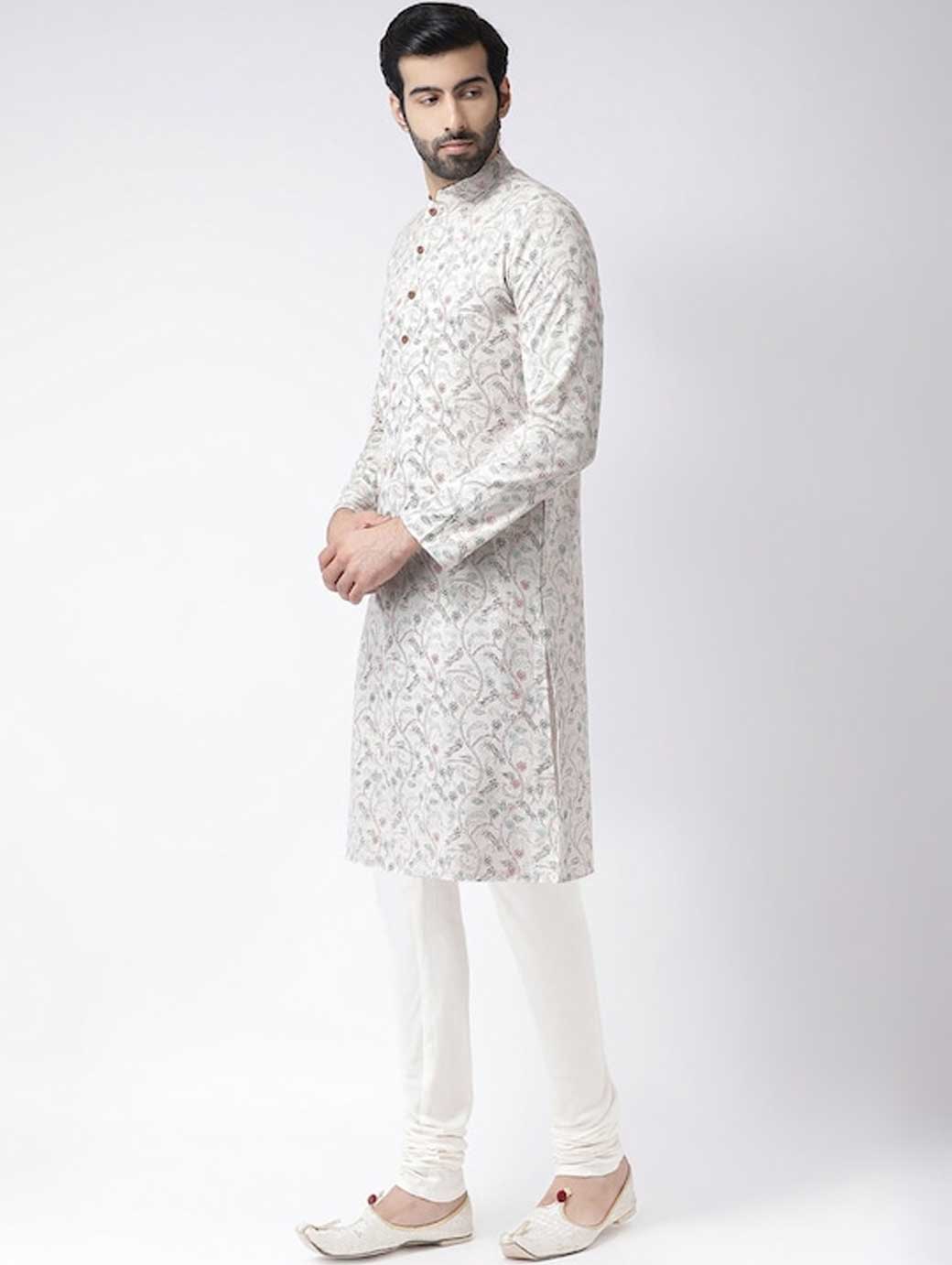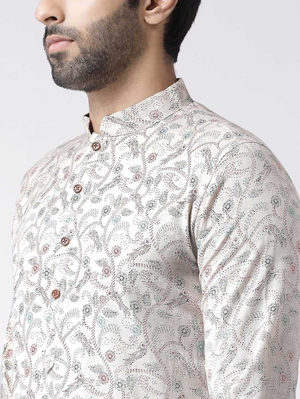 Off-White and silver-toned printed kurta with patiala Off-White and silver-toned straight above knee kurta, has a mandarin collar, long sleeves, straight hem, multiple slits Off-White and silver-toned Solid patiala, has elasticated waistband, slip-on closure