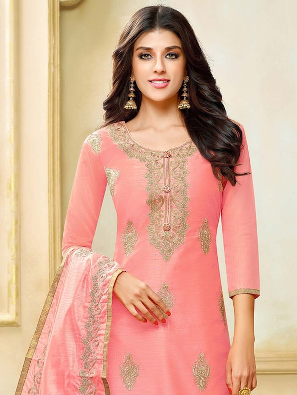 Peach-coloured and gold-toned embroidered unstitched dress material