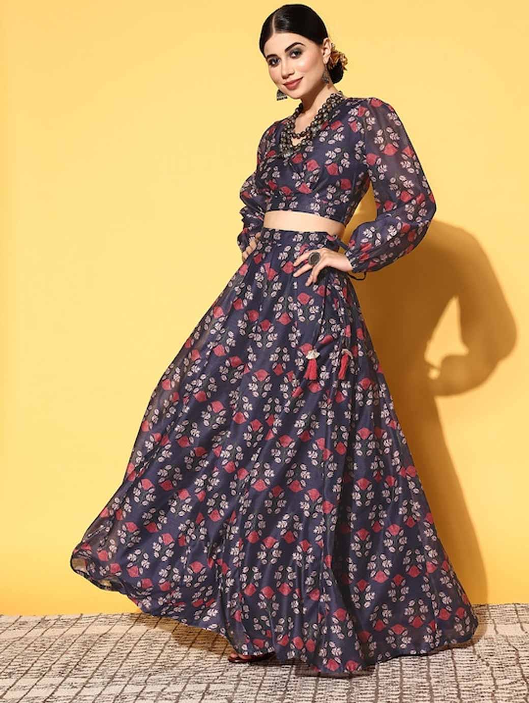 Win everyone’s hearts over by wearing this graceful lehenga choli. This lehenga choli comes with a V-neck and flared bottom to add to your traditional vibe.