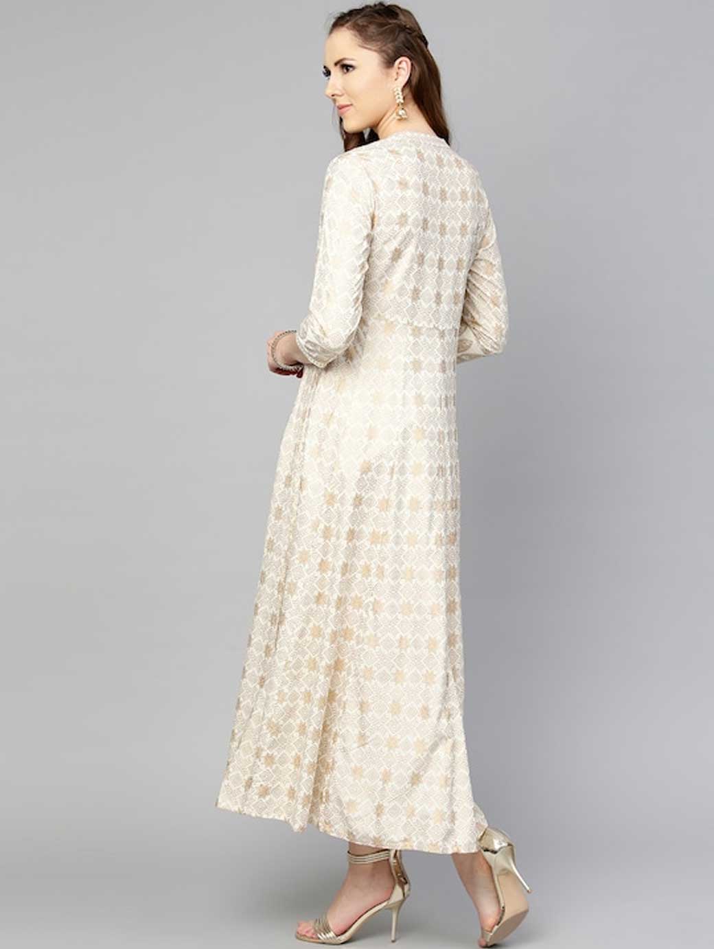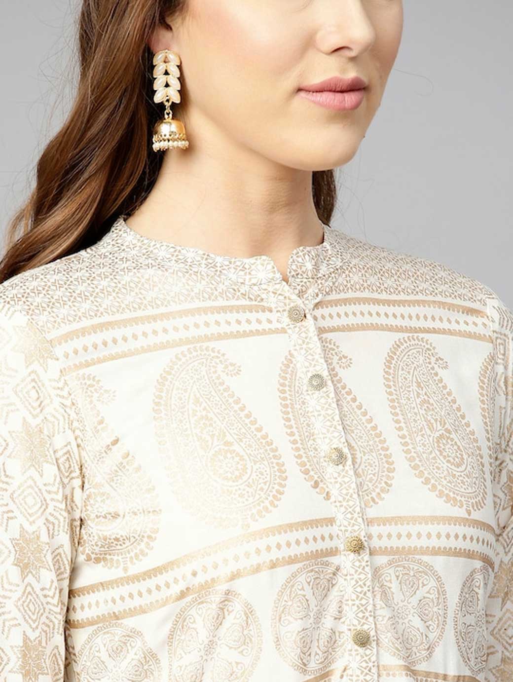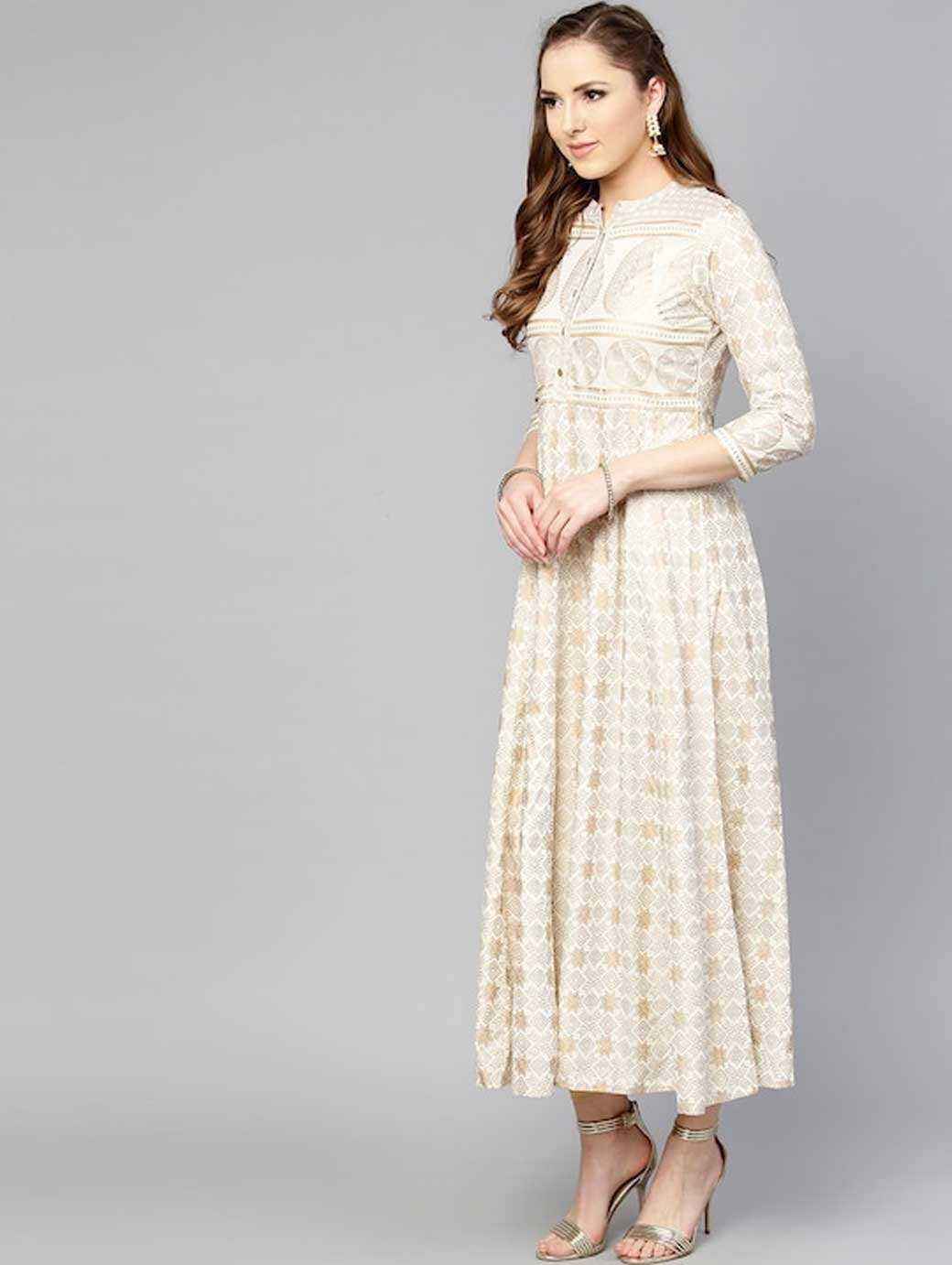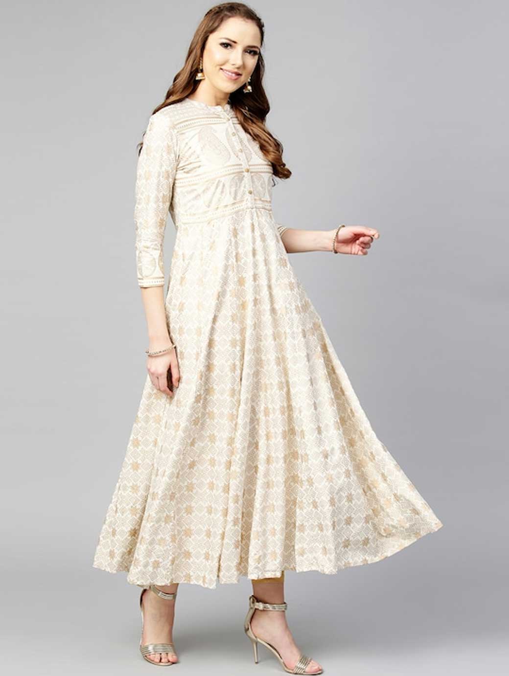 A round neck, three-quarter sleeves, and flared hem This product does not come with a mask. The mask on the model is only for styling purpose.
