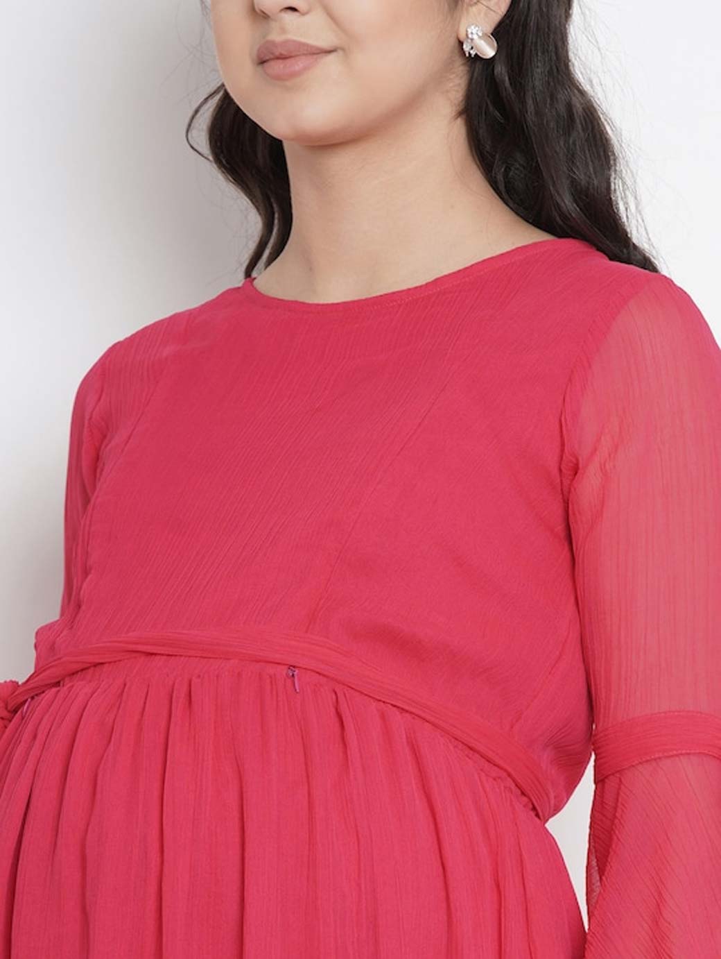 Pink solid woven maternity fit and flare dress, has a round neck, three-quarter sleeves, an attached lining, and flounce hem
