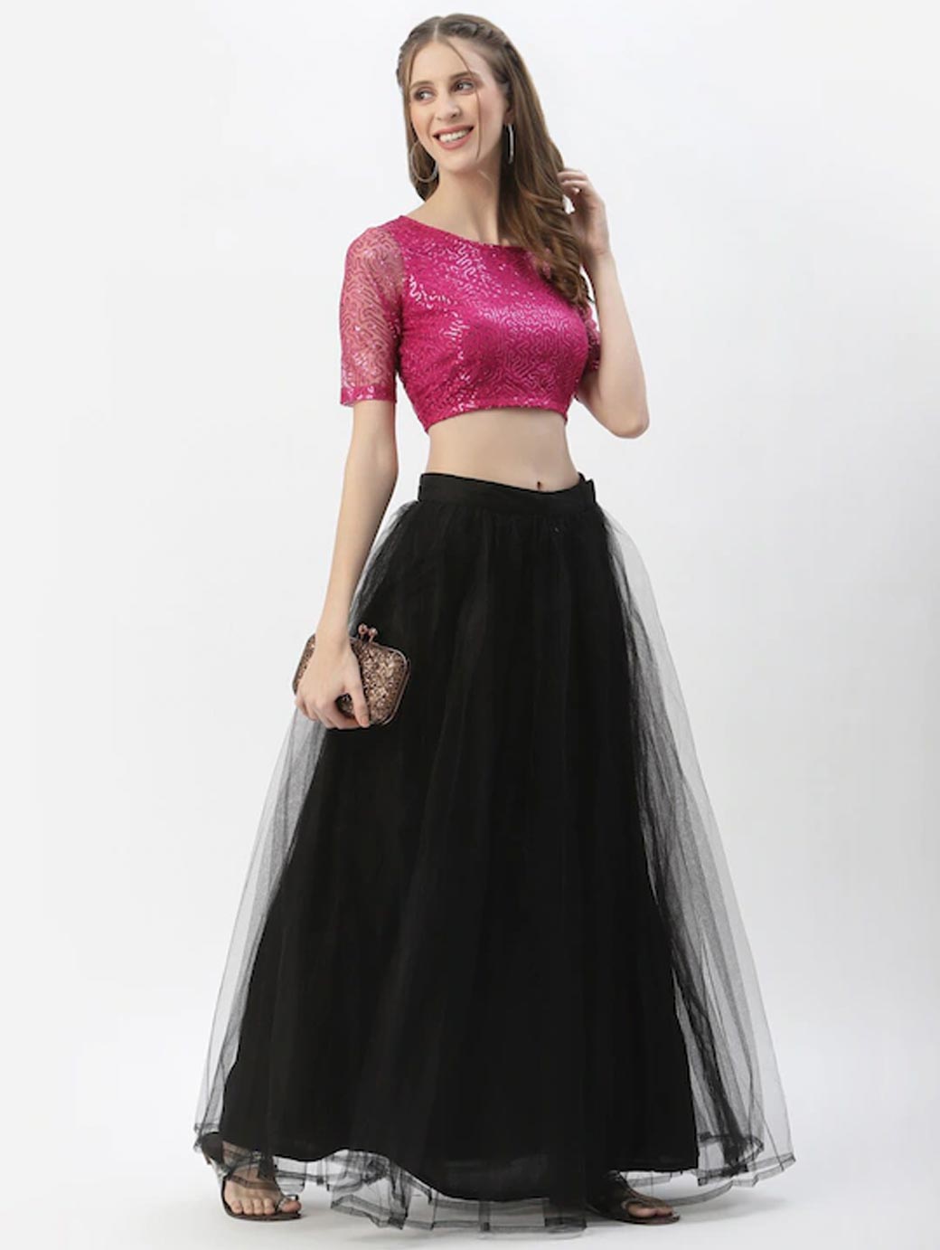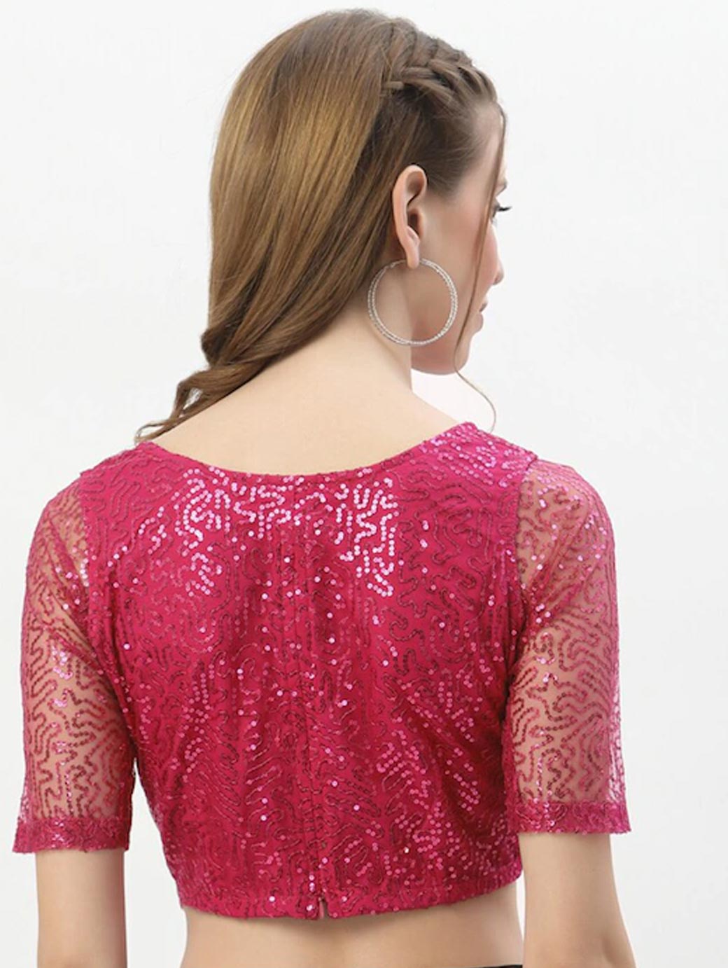 Pink crop regular top self design Round neck, short, regular sleeves Sequined detail Woven net Concealed zip closure.