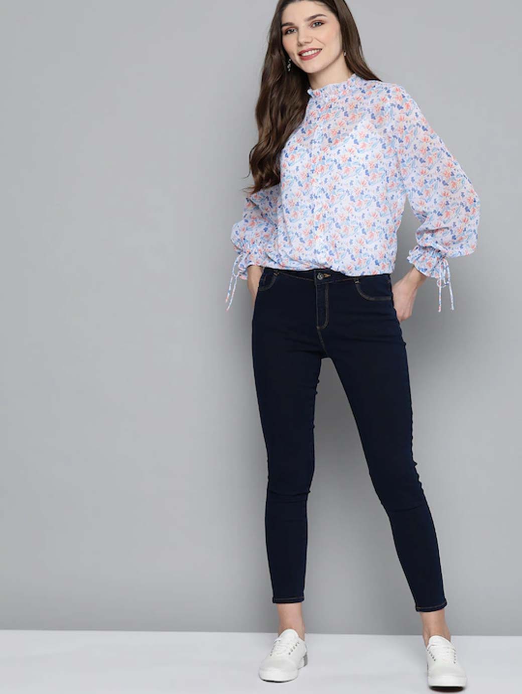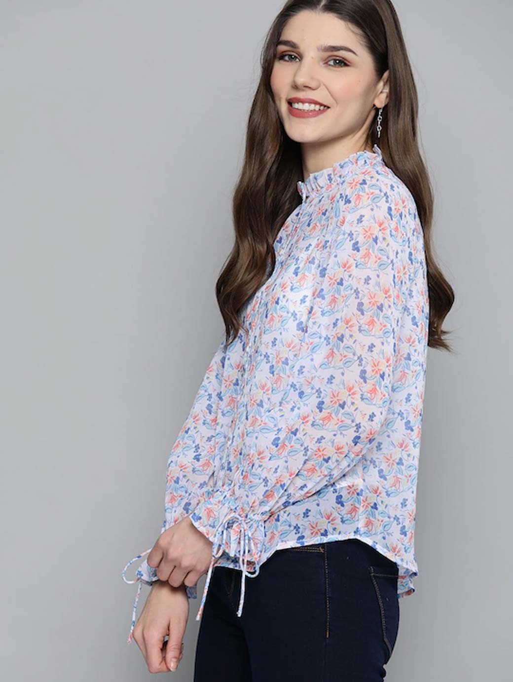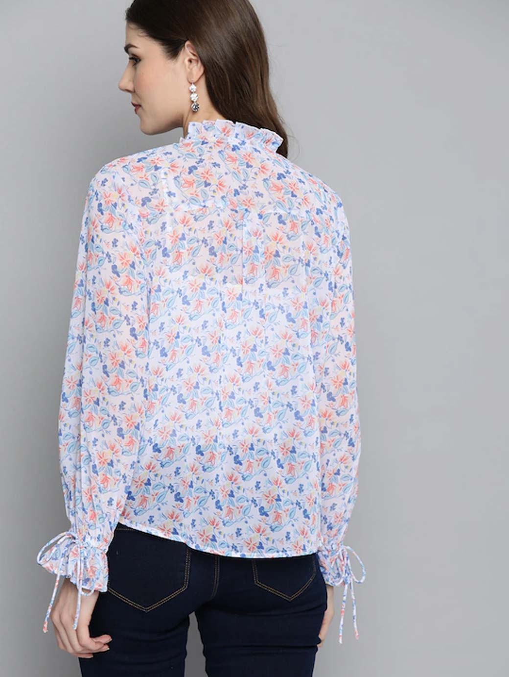 White & Blue Floral Printed Puff Sleeves Shirt Style Top