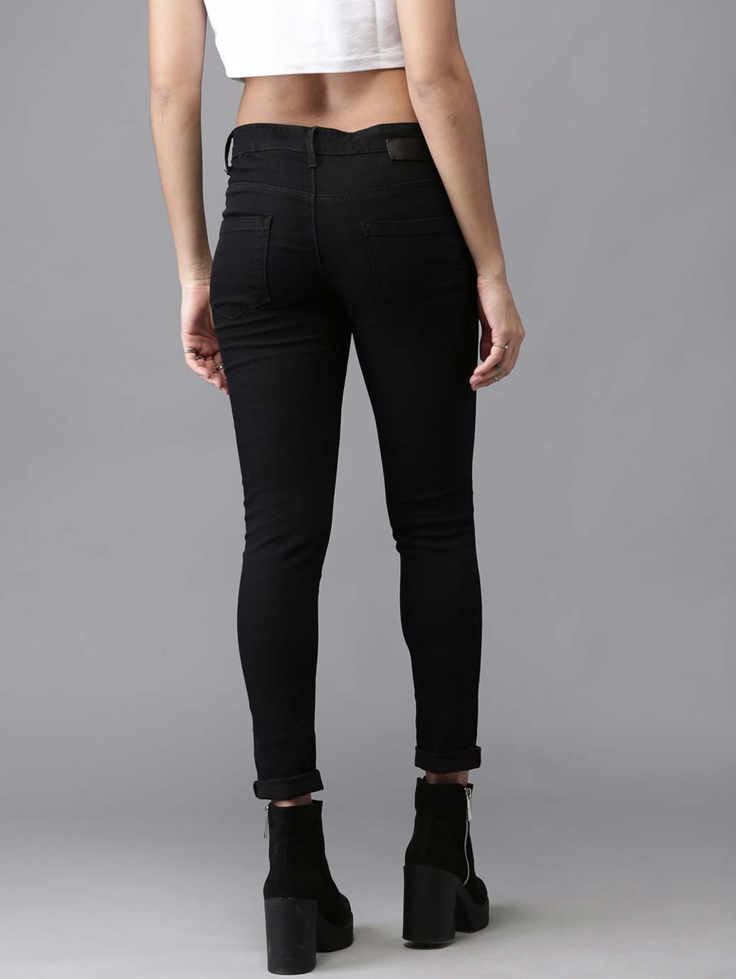 Black dark wash 5-pocket mid-rise jeans, clean look with no fade, has a button and zip closure, waistband with belt loops
