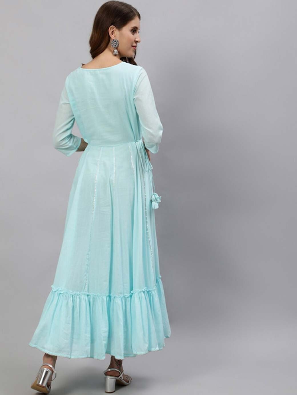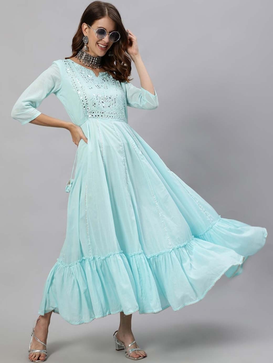 Women Blue Yoke Design Mirror Work Pure Cotton Anarkali Kurta