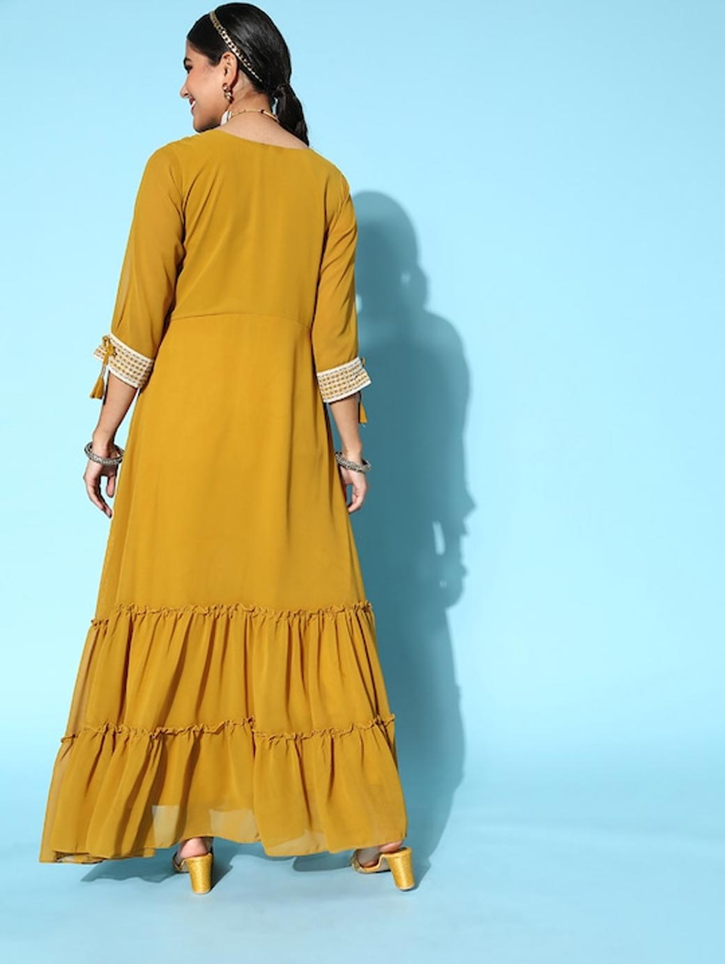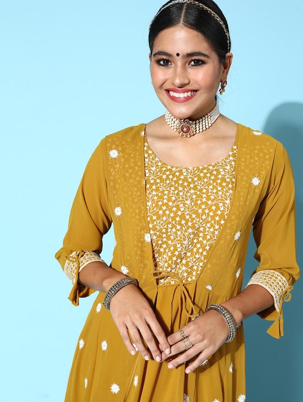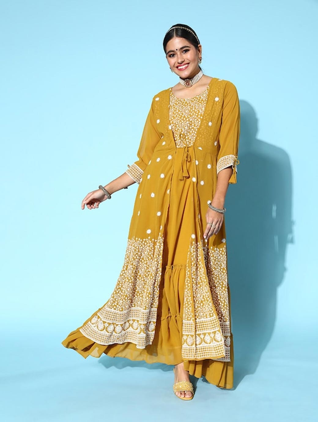 Your search for a modern yet ethnic piece ends with this trendy kurta. Boasting a beautiful flared hemline and a smart three-quarter regular sleeves, this piece will uplift your attire. Bright mustard tone Three-quarter regular sleeves Flared hemline Ankle length Georgette, hand wash Trend Alert With gathered volumes, tiers, pleats, bias drapes, and swaying silhouettes, the swirling volumes trend is a mix of whimsical and playful femininity. It plays with beautiful prints and patterns, such as floral, pastel colour-blocking, embroidered, Nu Noheme, floral all-over print, ombre, rich gold foil print, porcelain blooms, and so on.