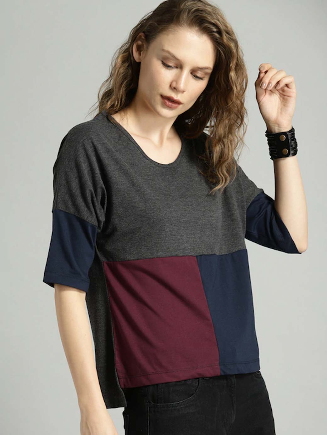 Charcoal, maroon and navy blue colourblocked T-shirt, has a round neck, short sleeves