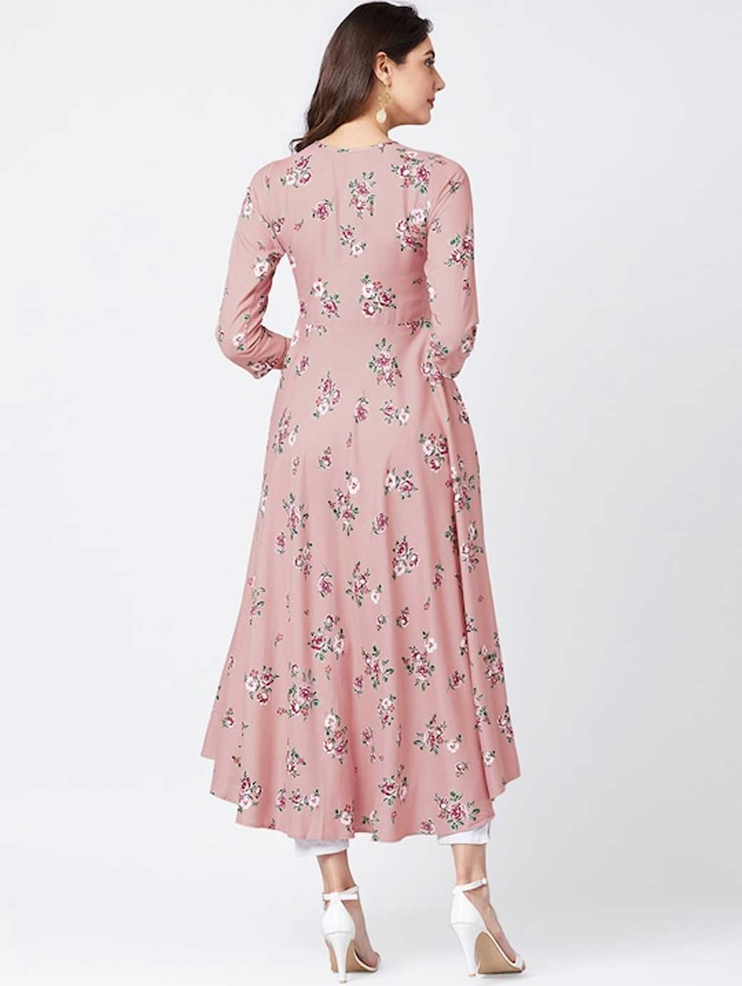 Pink printed anarkali kurta, has a round neck, three-quarter sleeves, flared hem