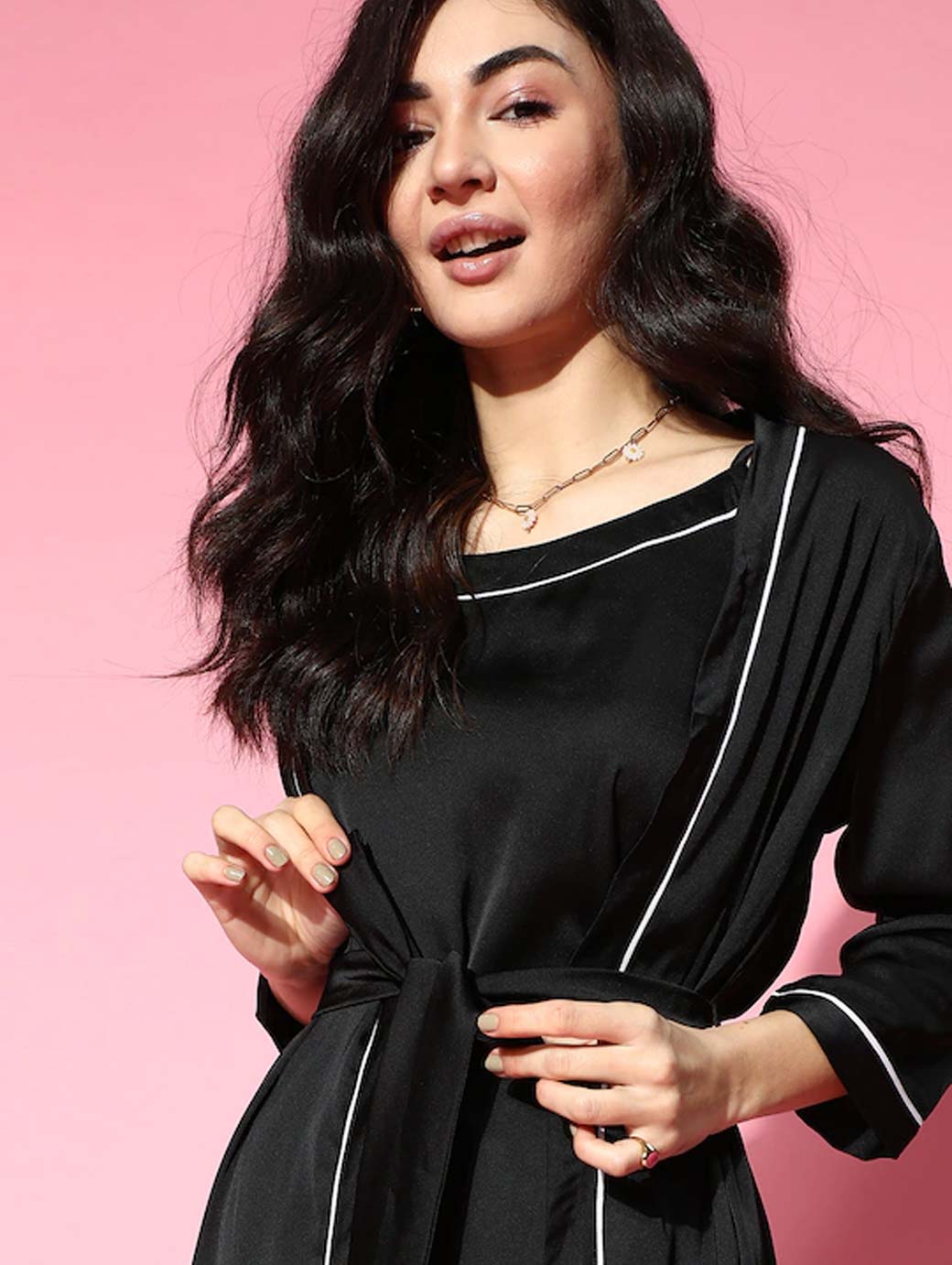 Add a subtle touch of elegance to your sleepwear collection with this graceful night suit. This night suit's lovely shoulder straps and three-quarter sleeves will keep you comfortable. Stylish black colour Classic solid pattern Shoulder straps Three-quarter sleeves Polyester, machine wash Trend Alert Silky and smooth, satin dates back to medieval China. With a lustrous surface on one side and a duller surface on the other, it is used in a variety of clothing styles to lend comfort and a rich look. The fall and flow of this fabric is its unique aspect. Convenient to wash and maintain, this fabric is a popular choice.